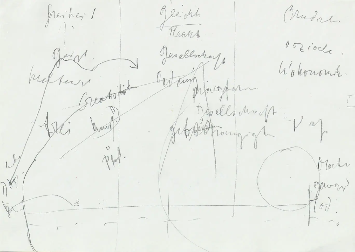 Beuys hat sich mit Fragen der Spiritualität, Philosophie, Religion und Geistesgeschichte zeitlebens intensiv auseinandergesetzt. So wird er auch das Lindenblatt nicht allein wegen seiner baumartigen Form ausgewählt haben, sondern er hat dessen mythologische Implikationen bewusst einfließen lassen. Das Lindenblatt, das im Nibelungenlied dafür sorgt, dass Siegfried an einer kleinen Stelle seines Rückens verwundbar bleibt, verweist auf die grundsätzliche Verletzlichkeit des Lebens. Die Sterblichkeit eint den Menschen mit der Tier- und Pflanzenwelt, was insbesondere in den zahlreichen Tierzeichnungen von Beuys immer wieder zum Thema wird. Die übergeordnete Idee der Einheit von Mensch und Natur fördert aber noch eine weitere Verbindungslinie in der Geistesgeschichte zutage: Der Kunstbegriff der Romantik, dem die Idee der Natur als schöpferische Kraft zugrunde liegt, hatte für Beuys einen bedeutenden Stellenwert. Nicht die Natur nachzubilden sei das Ziel der Kunst, sondern aus ihr Erkenntnis zu gewinnen und die eigene Imagination schöpferisch zu nutzen. Der Dichter der Romantik, Novalis, spitzte diese Kunstauffassung auf eine Weise zu, die Beuys kaum näher sein könnte: „Fast jeder Mensch ist in geringem Grad schon Künstler – Er sieht in der That heraus und nicht herein – Er fühlt heraus und nicht herein (Novalis Werke. Herausgegeben und kommentiert von Gerhard Schulz. Verlag C.H. Beck, München, 2001, S.394).